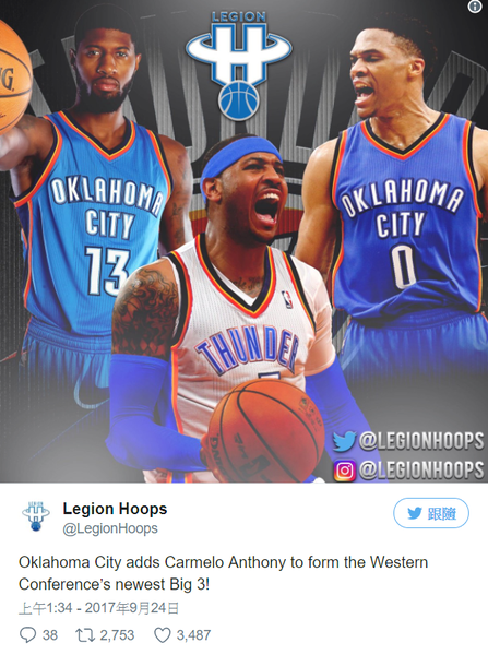 「我們對之前交易獲得Melo的操作感覺很好,」George說:「Melo這種傢伙可以把球隊帶到一個新的水平,在我看來,他是聯盟裡最好的球員之一,和他並肩作戰是一種奢侈,這絕對比在賽場上面對他要好。」